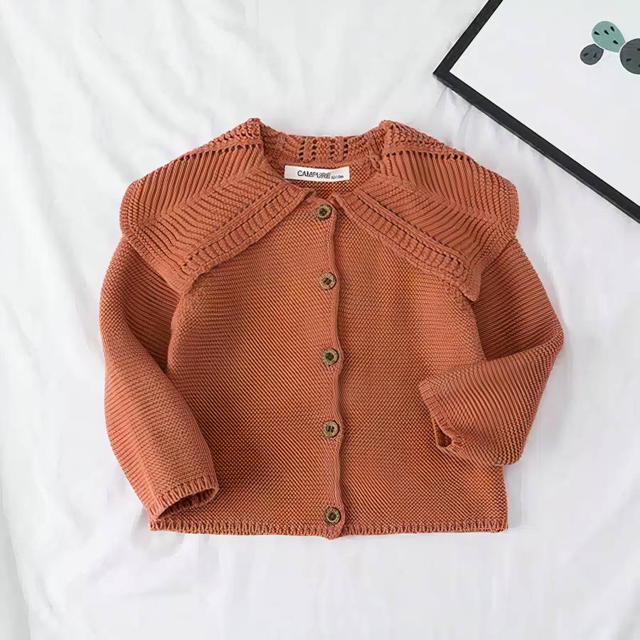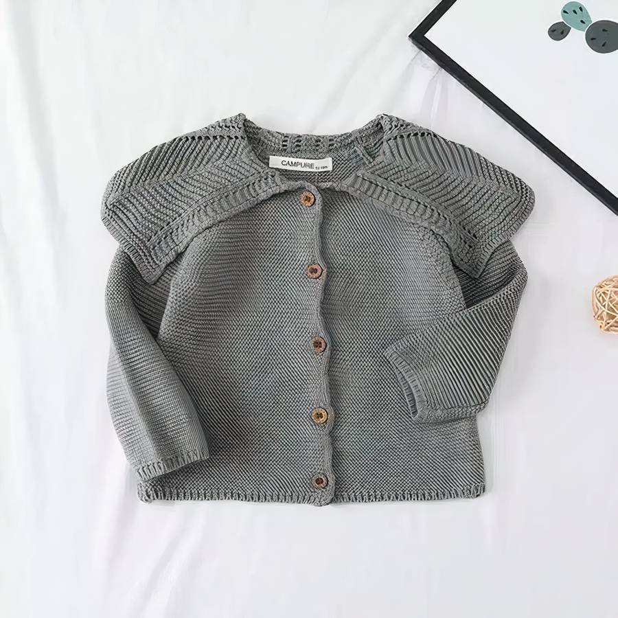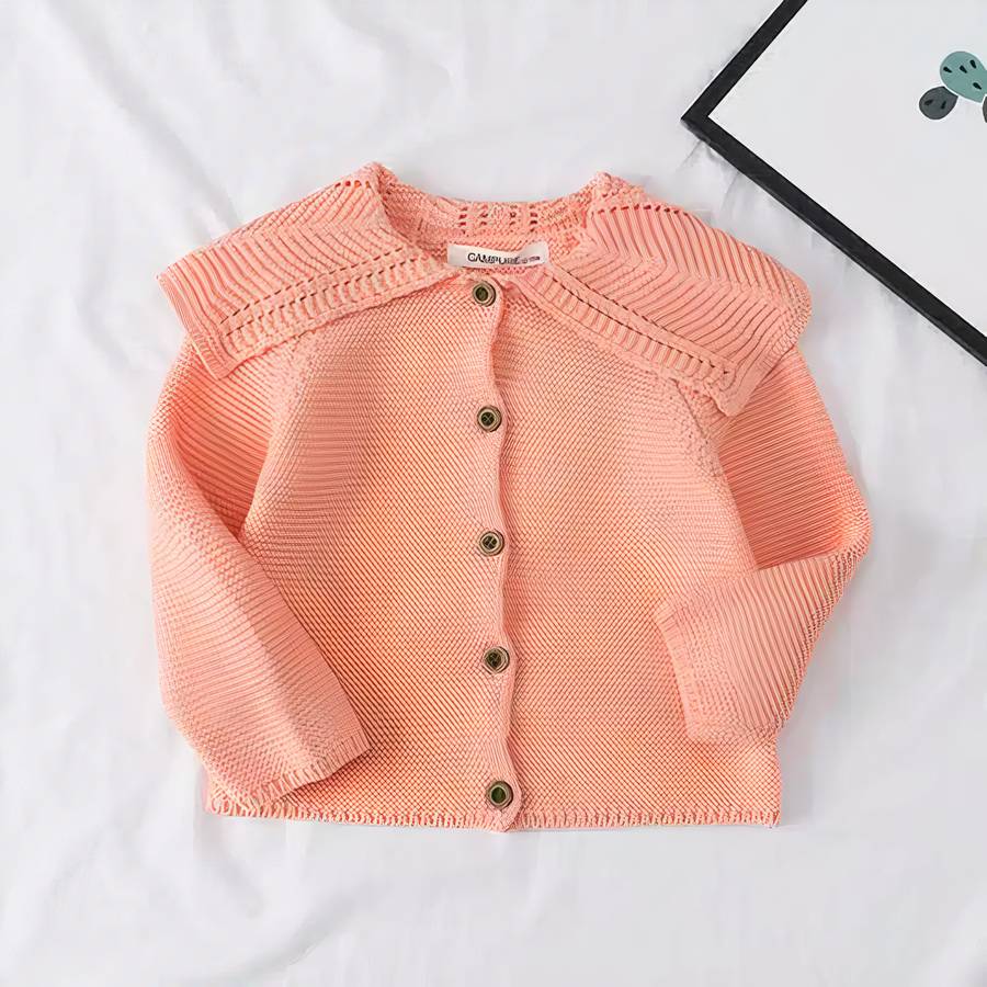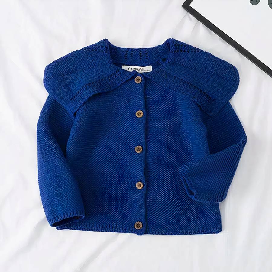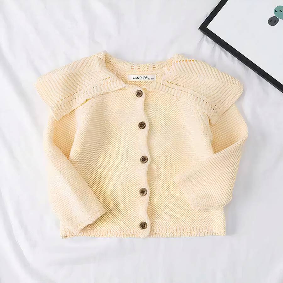 Découvrez le "Cardigan tricoté pour bébé avec col à pétales", un vêtement élégant et confortable conçu pour sublimer le style de votre petite fille.